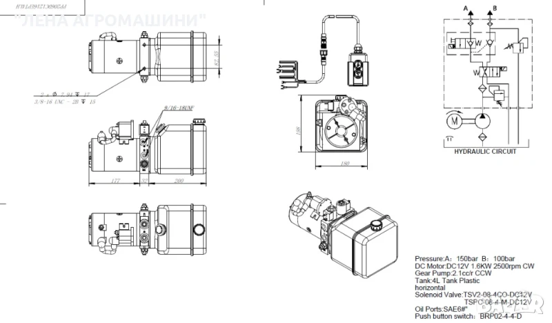 - DC12V, 1.6kW, 2.1cc/r, 4л пластмасов резервоар, 150 bar