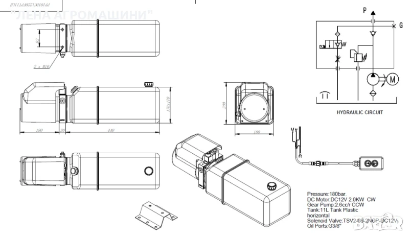 - DC12V, 2.0kW, 2.6cc/r, 11л пластмасов резервоар, 180 bar