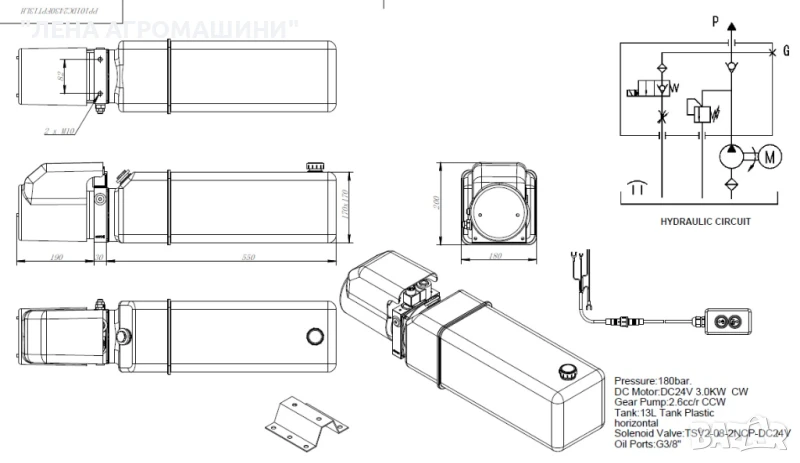 - DC24V, 3.0kW, 2.6cc/r, 13л пластмасов резервоар, 180 bar