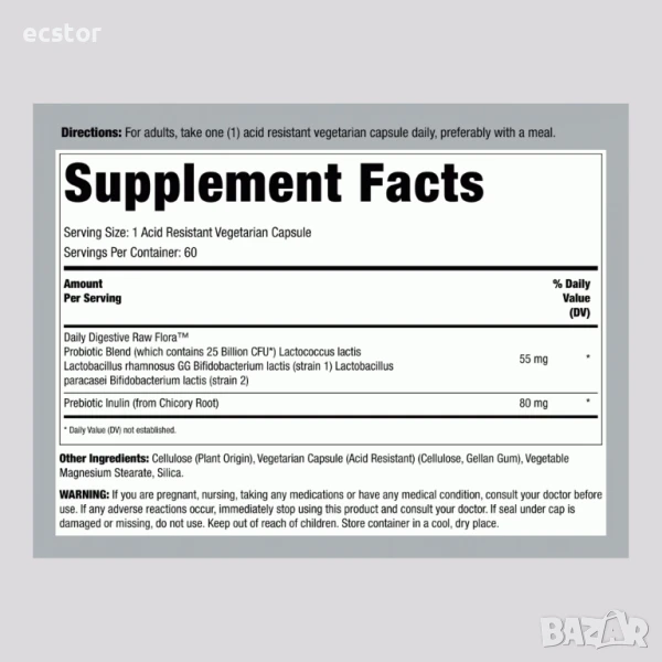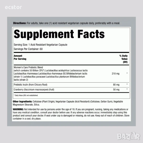 Особености: Една капсула дневно, без нужда от охлаждане. Предназначен за подкрепа на храносмилането, вагиналното здраве и имунната система. Произведено в САЩ според стандарти за добро производство (cGMP).