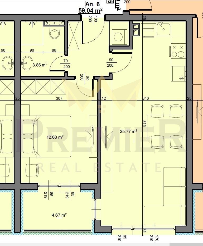 Състои се от хубаво входно антре с ниша за пералня и портманто, голяма всекидневна с кухненски бокс - 26м2, удобна спалня - 13м2, страхотна тераса с гледка към боровата гора и детската площадка, чудесна баня с тоалет - 3,9 м2.