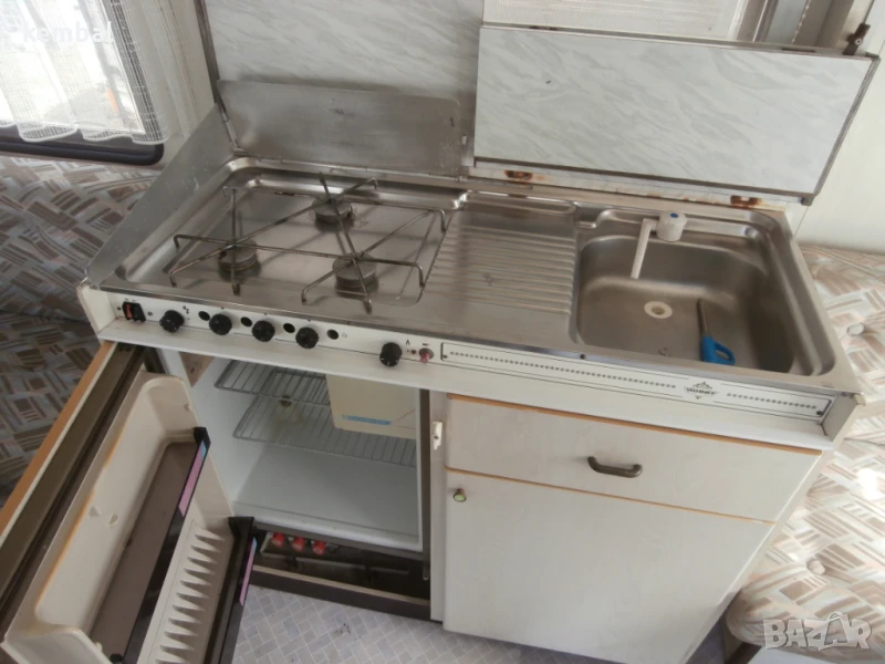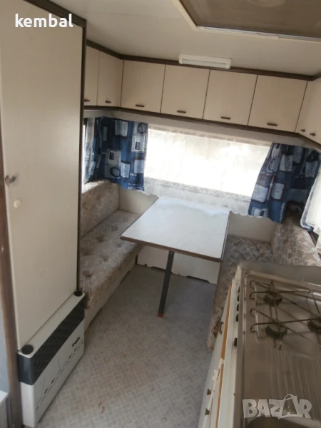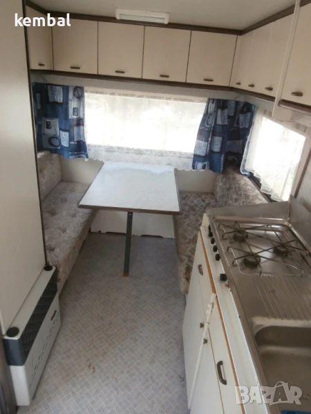 малка и компактна каравана за Стационарно ползване , може да се ползва като вила/офис/или място за живеене,има две отделни сепарета които стават на легла за спане на общо 4 човека, кухненски кът с мивка/котлони на газ/хладилник на газ и ток/и отоплителна печка на газ(ТРУМА),караваната е здрава без течове и належащи ремонти всички уреди са тествани и работят,свежа и готова за ползване