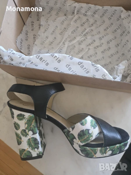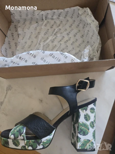 Нови супер ефектни сандали, естествена кожа, на фирма "Дарис". Токът е облечен, но с промазана материя, която не се задира. По етикет са 37, но са умалени. Реална цена 90 лв.
