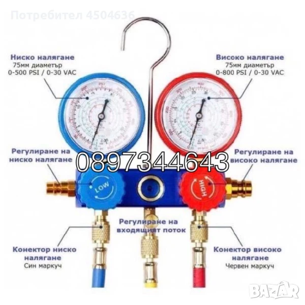 Hucko налягане: 0-500рѕі Измерван вакуум 0-30 In/Hg Комплектът съдържа: Kyka за закачване Манометри за ниско и вucoko налягане 3 бр маркучи: 90см 3 бр бързи връзки