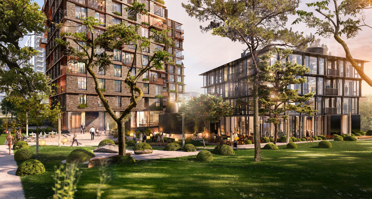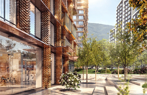 Акцентът е в нетрадиционните геометрични линии на сградите и във фасадите с отблясъци на мед и злато.