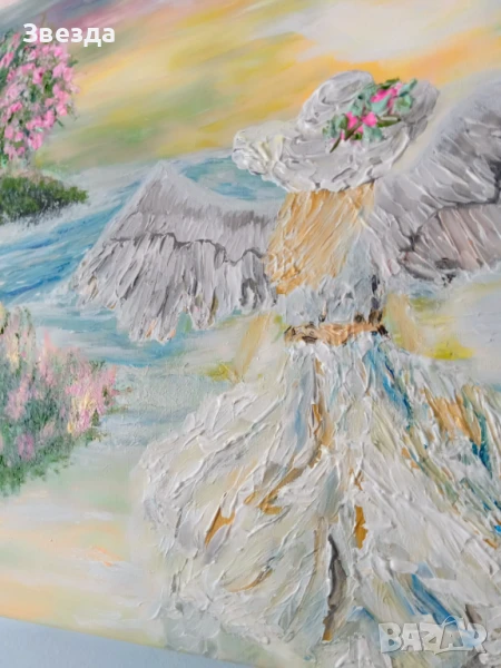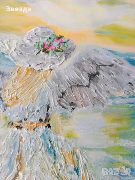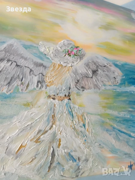 Картината е едно докосване до вечността. Ефирният ангел, изобразен на брега на морето, олицетворява чистота и надежда. Тялото, обвито в нежна бяла дреха, сякаш е част от вълните, а разперените криле, които се сливат с небесния простор, носят усещане за свобода и безметежност. Розовите цветове на изгрева и морските вълни създават успокояваща атмосфера, която пренася зрителя далеч от ежедневния шум.