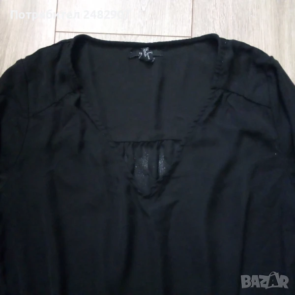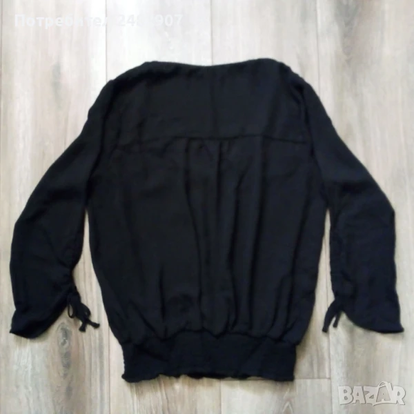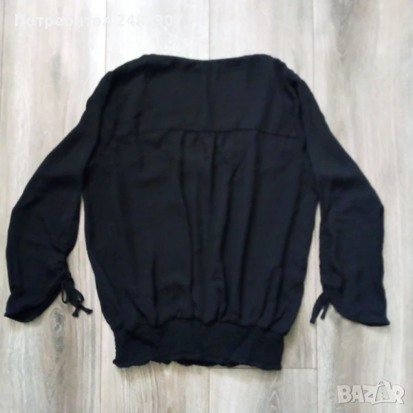Ефирна черна дамска блуза с ластик в талията и регулируеми връзки на ръкавите, размер S. Ширина в раменете - 37 см, ширина под мишниците - 49 см, ширина в долната част - 32 см, дължина от рамото до долу - 58 см, дължина на ръкава от рамото - 41см, ширина на ръкава в долната част - 12 см. Много запазена, почти не е използвана, полупрозрачна.