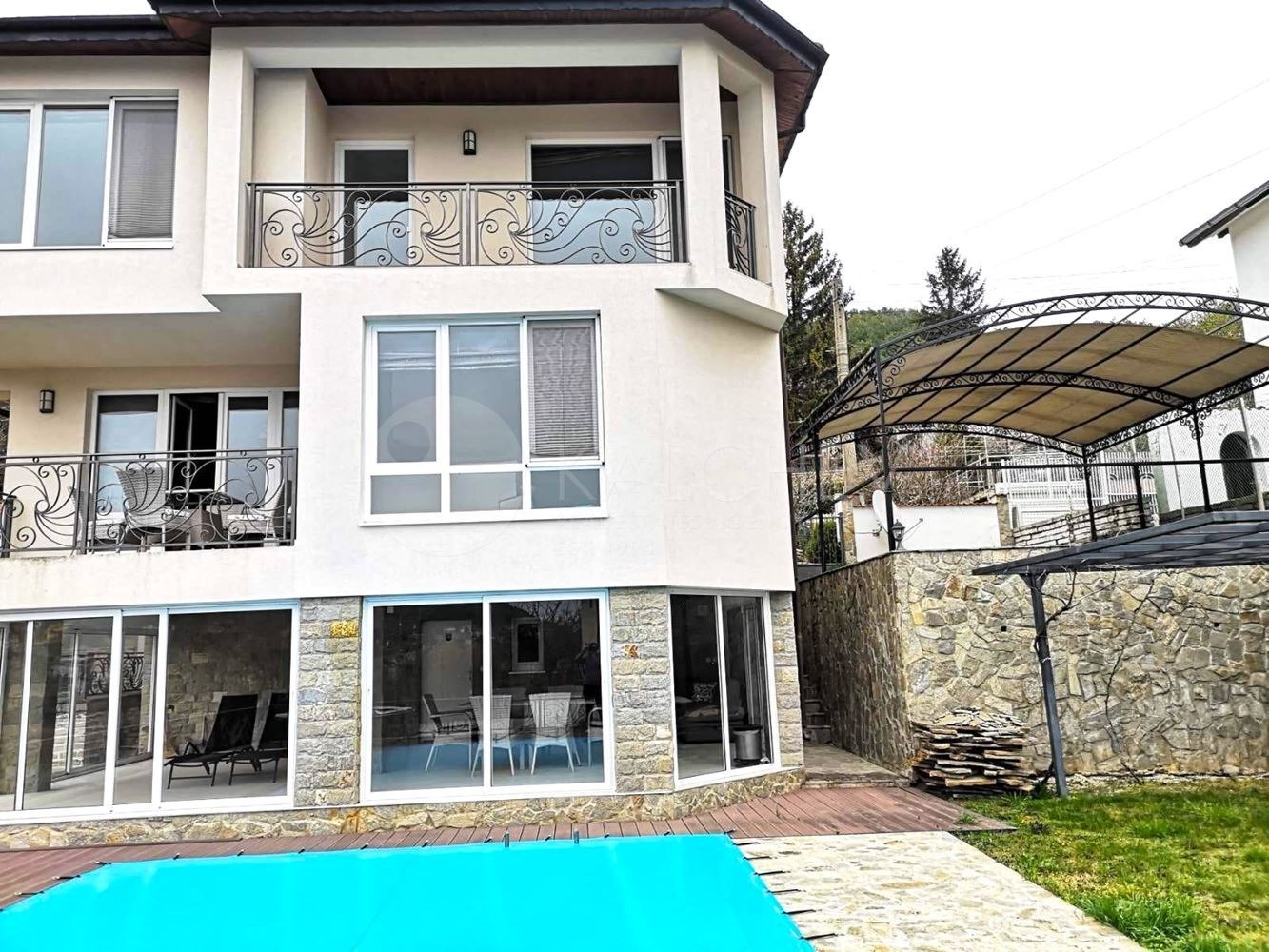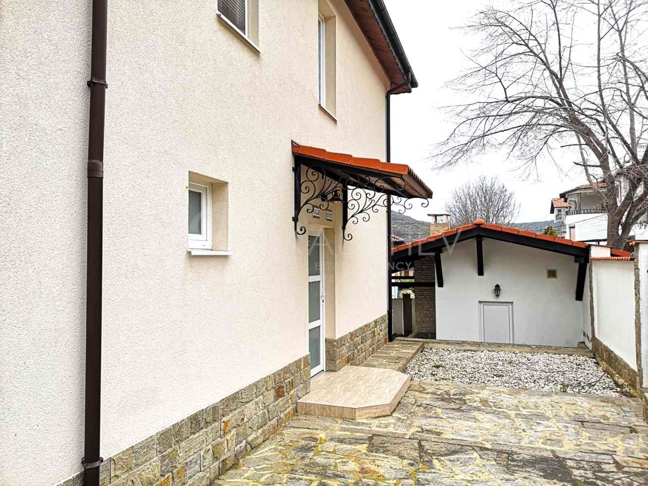 Къщата разполага с голям басейн, каменно барбекю, техническо помещение, паркомясто с навес.