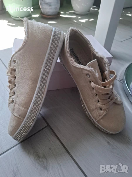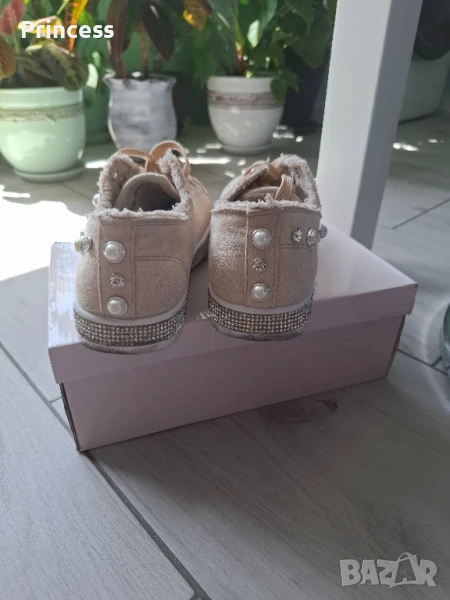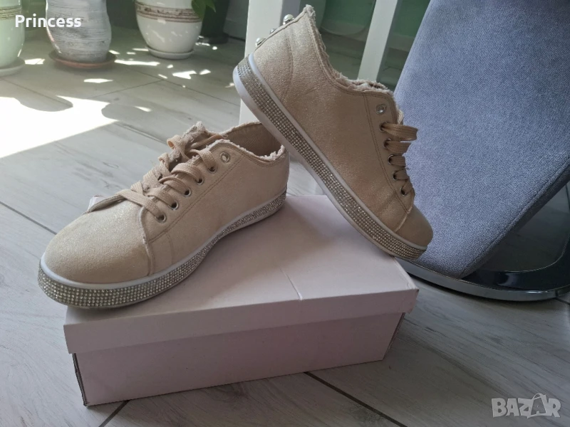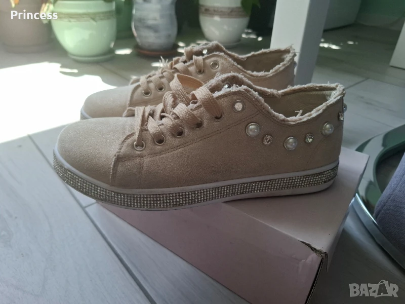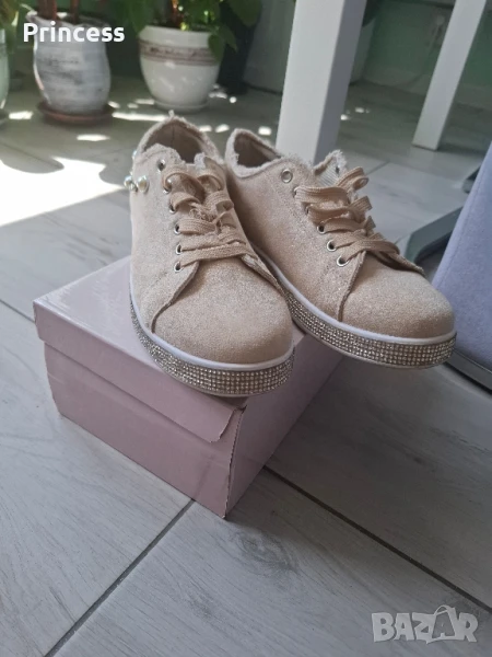 Дамски обувки в бежов цвят с лъскави камъчета отстрани по цялата подметка и перли Обувани са 2 пъти, с кутия Дължина на стелката: 25см