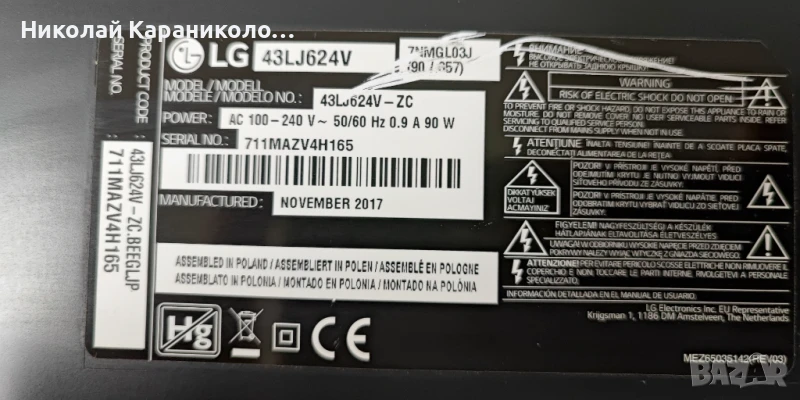Продавам Power-EAX67147201/1.4/,Main-EAX67129604/1.0/, SSC_43LJ61_7LED_REV02 тв LG 43LJ624V