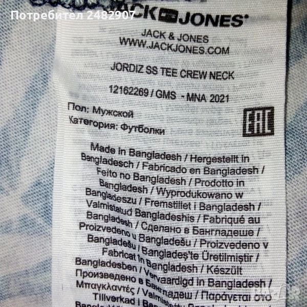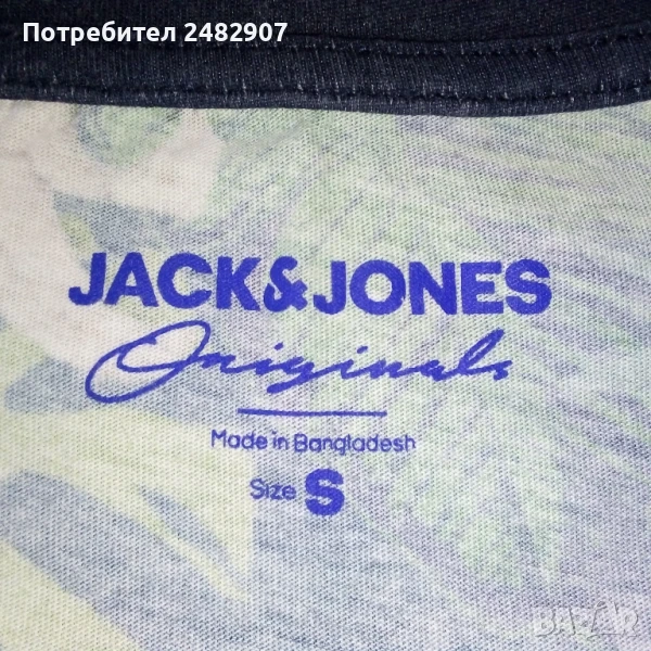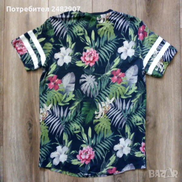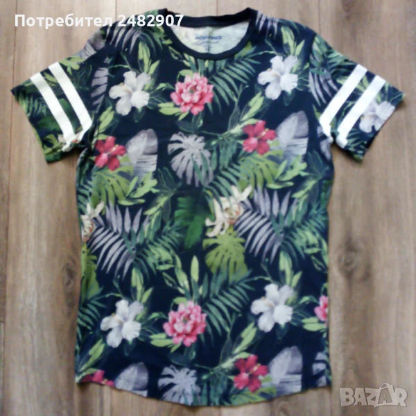 Мъжка тениска "Jack & Jones" с къс ръкав и флорални мотиви, размер S. Ширина в раменете - 42 см, ширина под мишниците - 52 см, ширина в долната част - 47 см, дължина от рамото до долу - 72 см, дължина на ръкава от рамото - 21 см, ширина на ръкава в долната част - 16 см. Много запазена, почти не е използвана.