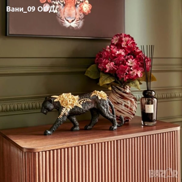 Декоративна фигурка на пантера с изящни златни цветя. Подходяща за украса на дом или офис. Изработена от висококачествени материали, с детайлно изпълнение. Ще добави стилен и изискан акцент към всяко пространство.