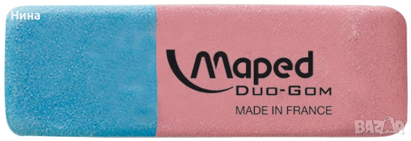 - ДВОЙНА ГУМА: Maped's Duo-Gom има две различни приложения. Розовата страна изтрива молив и графит, а синята страна изтрива мастило.