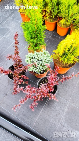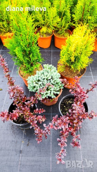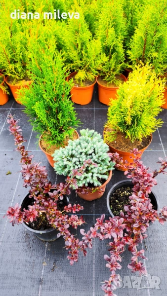 Пакетът съдържа 1 бр Туя Смарагд, който е в свежо зелен цвят, 1 бр Туя Златен Смарагд, който е лимонено жълт, 1 бр Хвойна Синя Звезда, която е в небесно син цвят и 2 бр Берберис Атропурпуреа Нана, които са огнено червени!! Идеална цветова комбинация за цветни петна в градината или за кашпи и големи саксии! Всички растения са за супер слънце и се гледат много лесно! Искат подхранване един път месечно, за да са хубави и гъсти и с наситени цветове и редовно поливане, в жегите всеки ден! Растенията са гледани на полето на супер слънце! Височината и формата им може да се контролират с рязане без проблем!