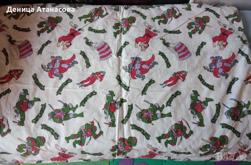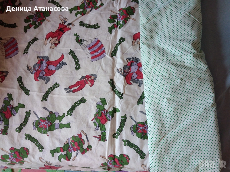 - Детска олекотена завивка с картинки на Костенурките нинджа размер 125/90 см + памучен чаршаф 155/88 см бял на зелени точки като долната страна на юрганчето - общо 10 лв.