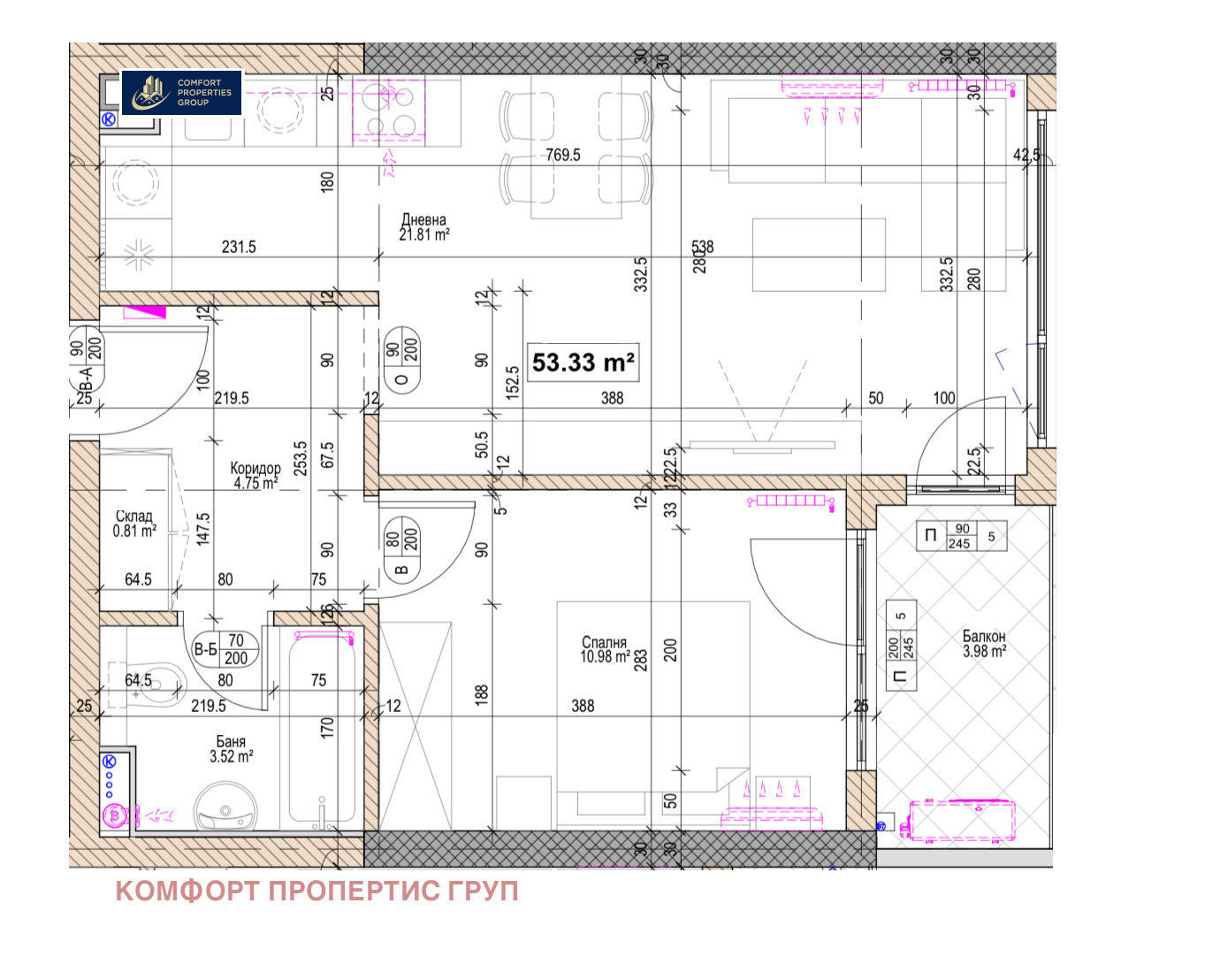 Comfort Properties Group има удоволствието да представи на своите клиенти Двустаен Апартамент в нова жилищна сграда в близост до един от основните булеварди на София Цариградско шосе и на няколко минути от Орлов мост в кв. Полигона