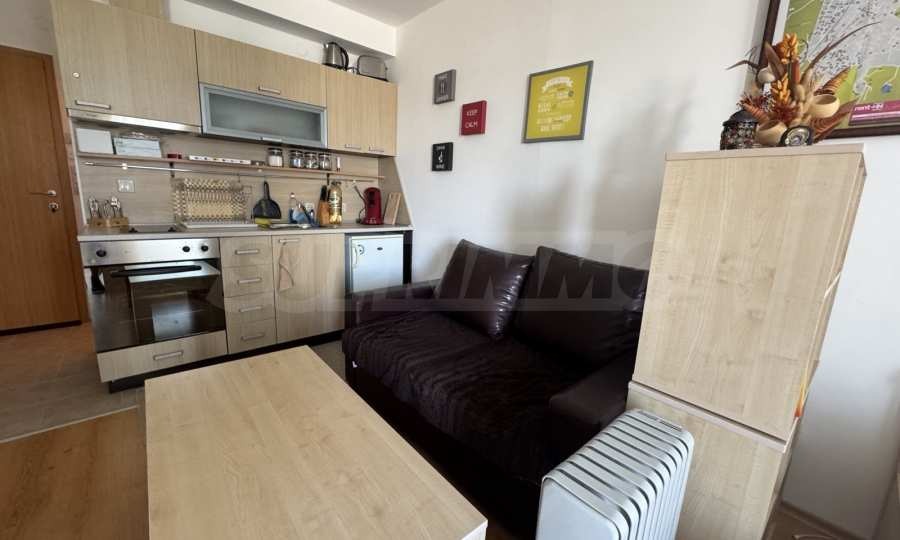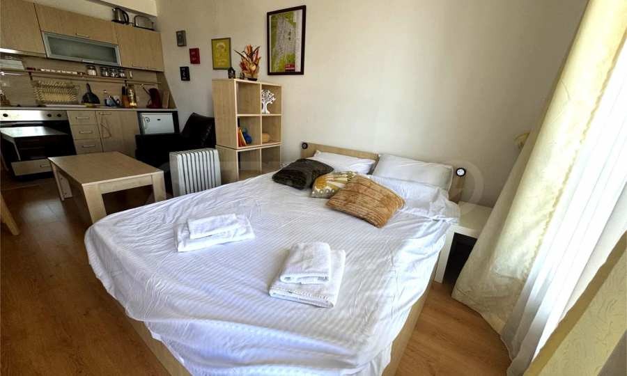 Апартаментът е тип студио и разполага с разтегателен диван, спалня, маса за хранене, напълно оборудвана кухня, тераса, баня с вана и тоалетна.