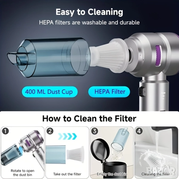 ✅ Комплект приставки – различни накрайници за почистване на клавиатури, интериор на автомобил, тесни пространства и мебели.