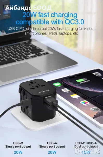 Зареждане: 20W бързо зареждане на всички портове. USB-C PD с единичен изход от 20W – подходящ за бързо зареждане на различни смартфони, iPad-и, лаптопи и др.