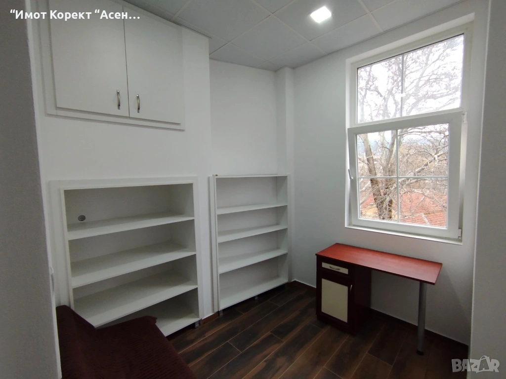Офиса е с поръчкови шкафове и рафтове, нов ламинат и нова дограма.