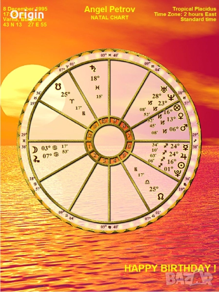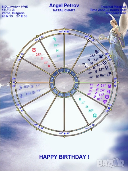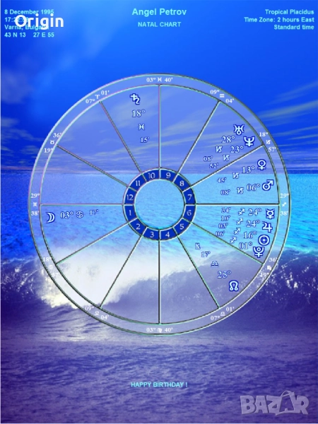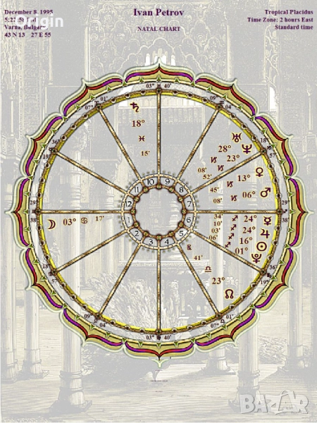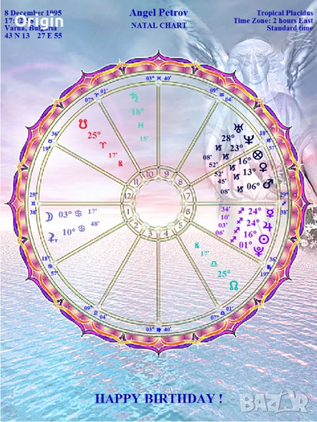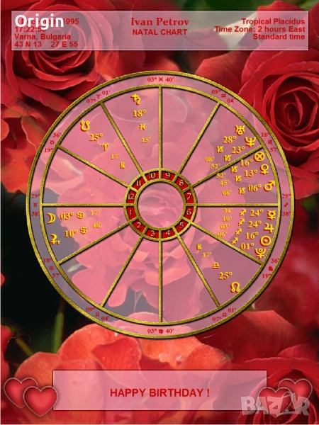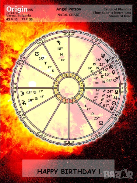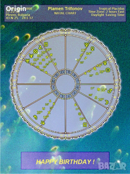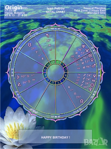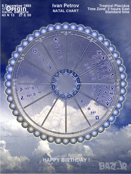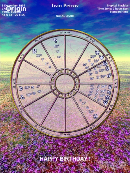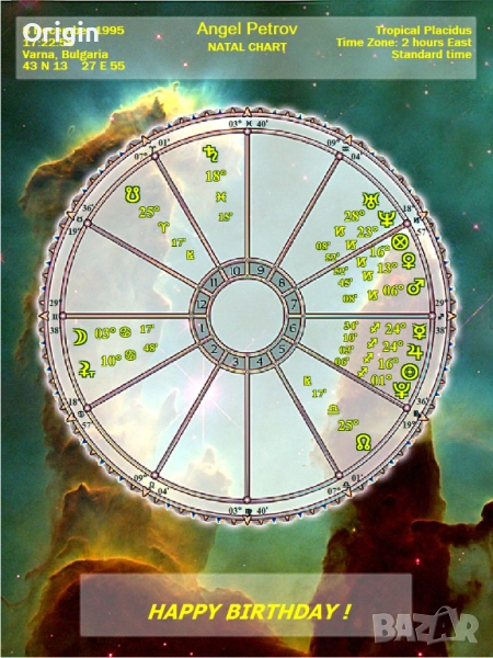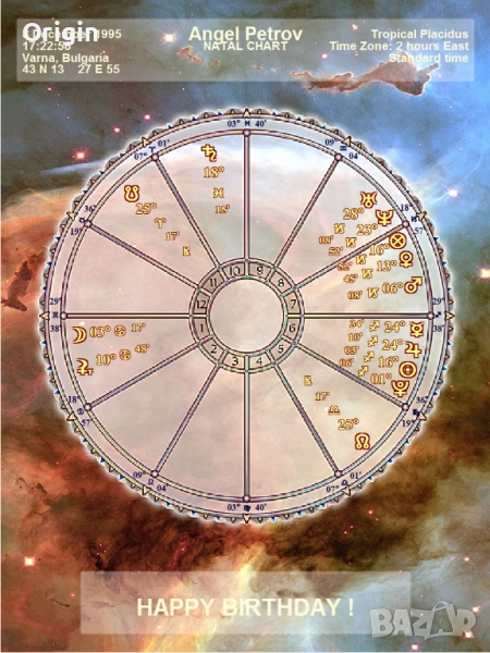 Предлагам изготвяне на арт хороскоп, идеален вариант като подарък за рожден ден . Има възможност за 30 визуални разновидности( освен тези 18 на снимките, има още 12 вида) Хороскопът е закрепен в папка с цветна първа страница и подробно описание на всички важни положения в наталната карта, както и разтълкуване на наличните аспекти. Необходими са място, дата и час на раждане. Ако не се знае часът на раждане - може да се изготви само така наречената "космограма".