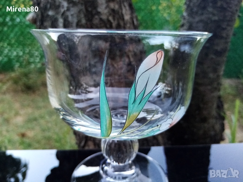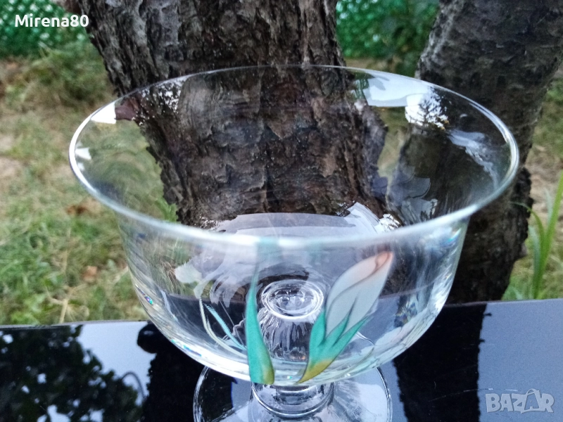 Красива бонбониера на кристално столче с нежен флорален декор. Нова, с етикет за ръчно измиване (без съдомиялна). Вис. 12, диам. 11 см. Подходяща и за подарък !