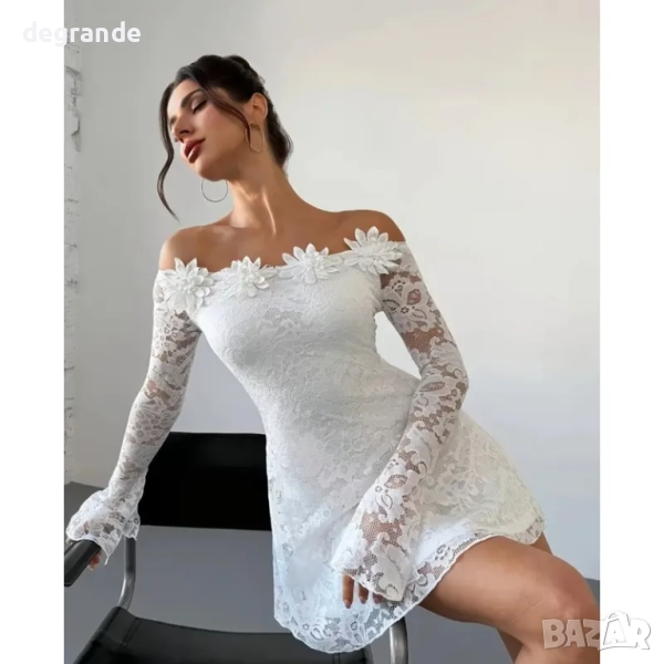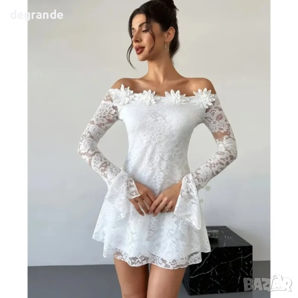 дамска нежна къса рокля с отворени рамене и апликация от цветя