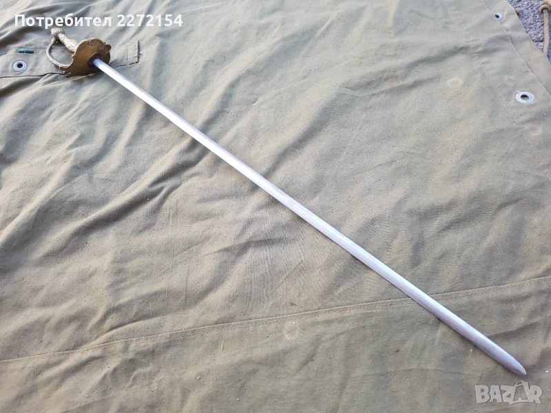 Дипломатическа шпага от края на 19 век. Единствена забележка, канията,която е от кожа е счупена и има нужда от съединяване. Шпагата е без луфт или други забележки. Обща дължина без канията 79 см. Обявената цена е за изпращане по Еконт с наложен платеж, но с лично предаване в Русе или с предварително изпращане на парите по Изи пей,цената е 500лв.