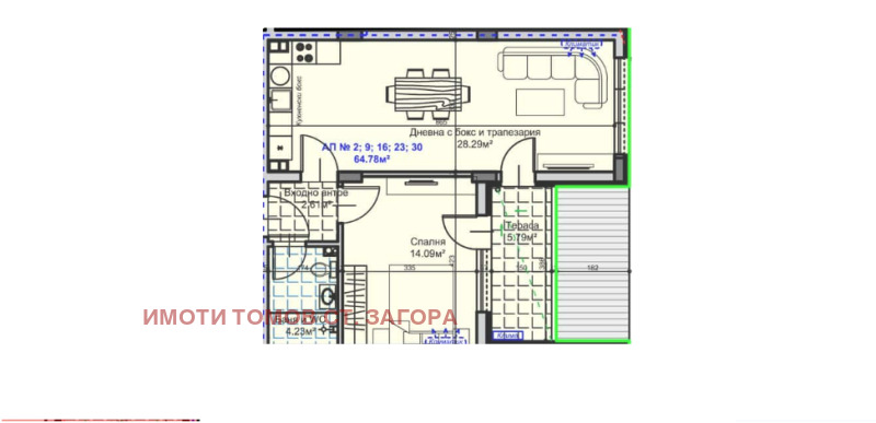 Имоти Томов Стара Загора представя на Вашето внимание, БЕЗ КОМИСИОННА ОТ КУПУВАЧА, двустаен апартамент с площ от 88,70 кв.м. в квартал Железник-запад. Имотът е разположен на втори етаж в новострояща се седеметажна жилищна сграда и се състои от: