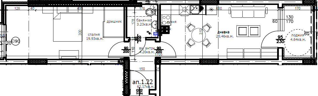 Апартаментът ще бъде завършен по БДС с монтирана входна врата, изградени ВиК и ел. инсталации. Към жилището има възможност за закупуване на подземно или външно паркомясто.
