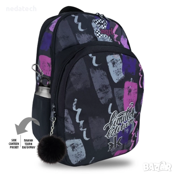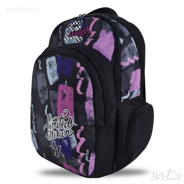 Ученическа раница в черно с лилав и фуксия мотив с бяло-черно плюшено мече с принт "Limited Edition". Разполага с 2 големи отделения и 1 малко, отделение с цип и отделение с неопренова подплата отстрани, мек анатомичен гръб, отделение за лаптоп, органайзер, калъф за очила, черен ключодържател с помпон и светлоотразителни ленти. Идеална за ученици от началното училище и тийнейджъри.