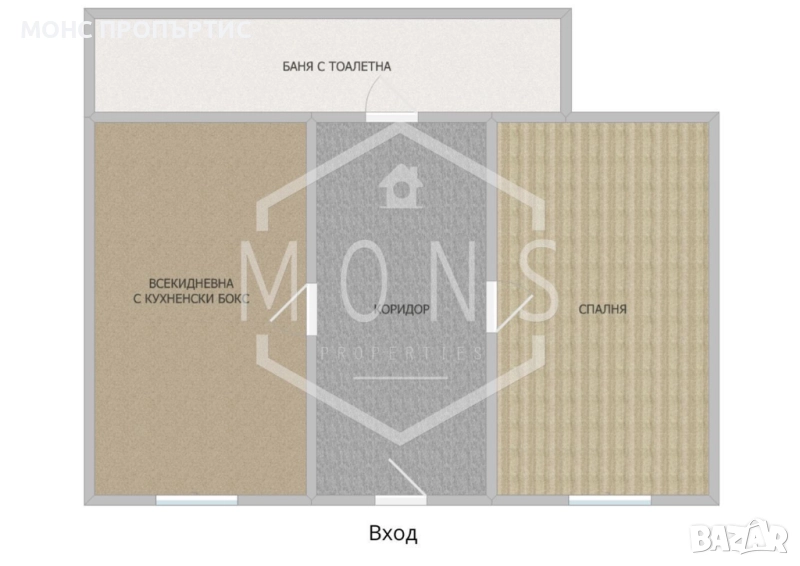 Разпределението е както следва: една спалня, всекидневна с кухненски бокс, баня с тоалетна и коридор.