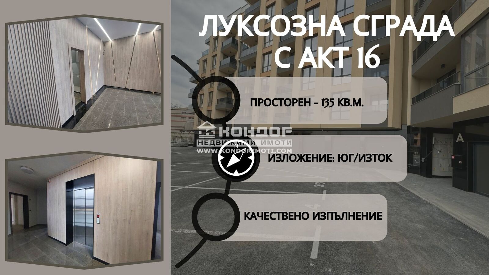 Оферта 58311: AKT 16!!! Предлагаме на Вашето внимание функционален 3-СТАЕН апартамент с прекрасно изложение ИЗТОК/ЮГ в новопостроена луксозна сграда, отличаваща се със съвременна и стилна архитектура. Района, в който се намира, се отличава със спокойна и чиста среда, близост до всички изходни артерии на града, както и прекрасна гледка към Родопите на юг и Гребна база на север. Просторни и изчистени форми оформят желаното от всеки клиент жилище - състои се от просторна югоизточна дневна - 33 м2 оформена на кътове: кът за мека мебел, трапезария и светъл кухненски бокс с излаз на тераса, две големи самостоятелни спални 13 и 14 м2 с излаз на чудесна обща тераса 20 м2, баня с WC, втора тоалетна, входно антре и избено помещение /включено в цената/. Завършена е с висококачествени материали, според всички изисквания за топло и хидро изолация в съвременно строителство - блиндирана врата, 6-камерна дограма, луксозно завършени общи части, хидравличен асансьор, гранитно стълбище. Възможност за закупуване на паркомясто и гараж. Подарете на Вас и Вашето семейство дом, съчетаващ лукс, удобство, усещане за простор и невероятна гледка към Родопите, в който да релаксирате пълноценно след натоварения работен ден. Осигурено банково кредитиране за клиенти на агенцията на специални условия. ВИЖТЕ ОЩЕ ИЗГОДНИ ОФЕРТИ НА https://www.kondorimoti.com/ С ЕЖЕДНЕВНА АКТУАЛИЗАЦИЯ!