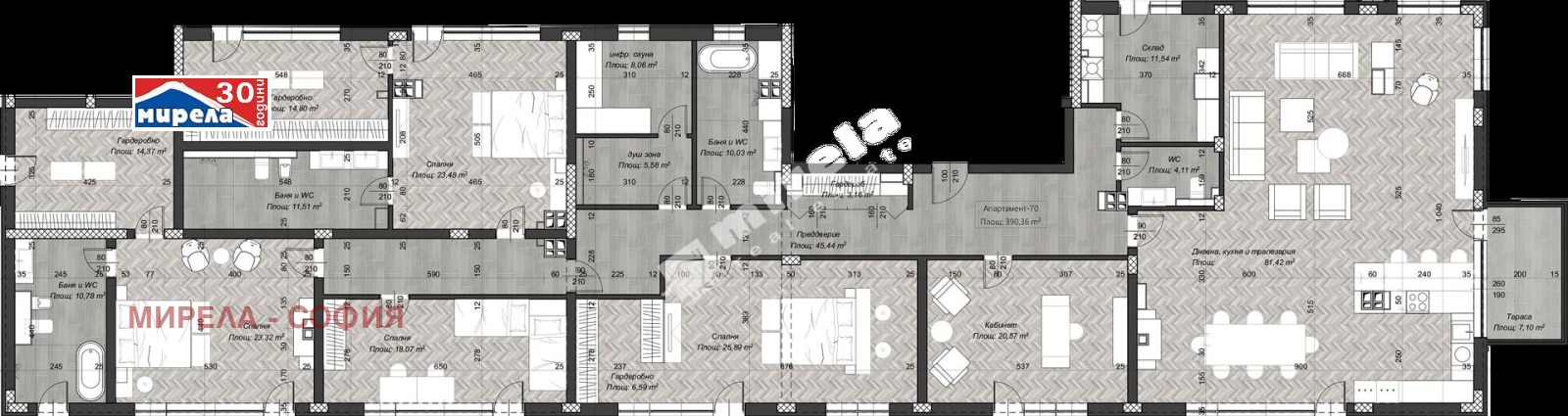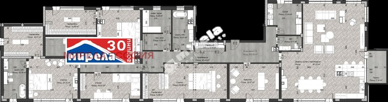 С тази оферта ви представяме апартамент с кухня и трапезария, пет спални, три бани, една тераса и е с обща площ с покривна тераса - 823.48 кв. м.