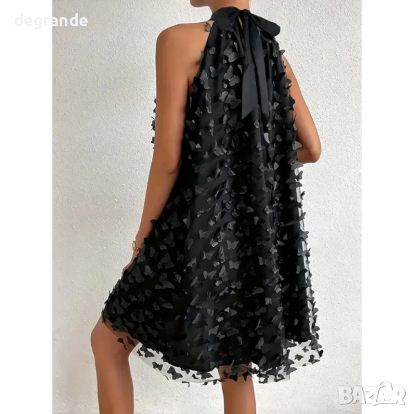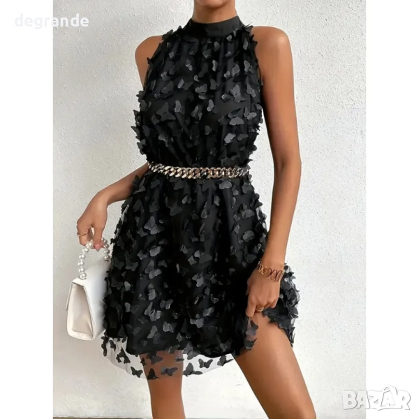 дамска коктейлна рокля свободен модел от два пласта: основа от черна полиестерна материя и горен пласт от мрежа с 3D пеперуди