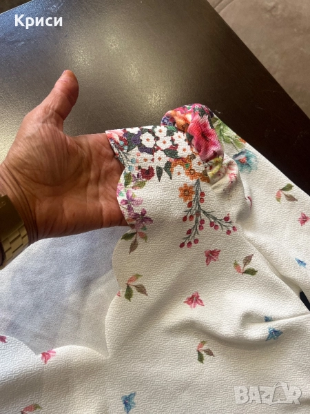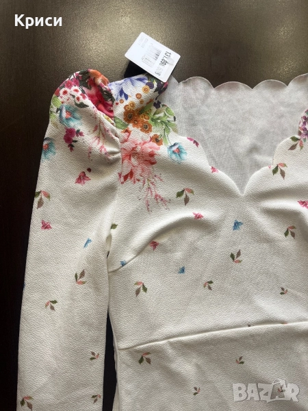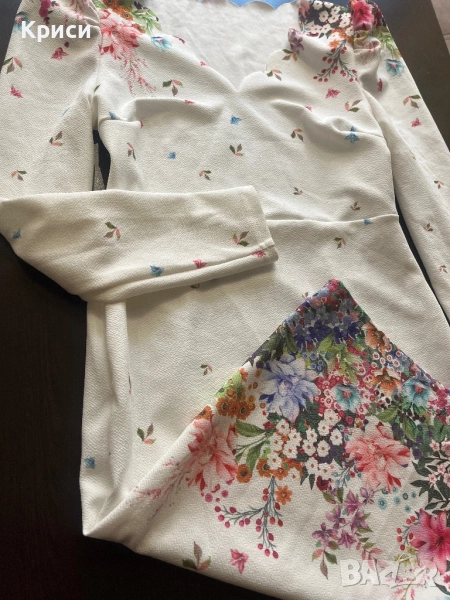 Нова бяла рокля на цветя , купена от Ремикс , но ми е малка и е над коляното . Размерът е 38/ М . Има еластичност и е с цип отстрани . Много лека и приятна материя , като еластичен жоржет е на допир.