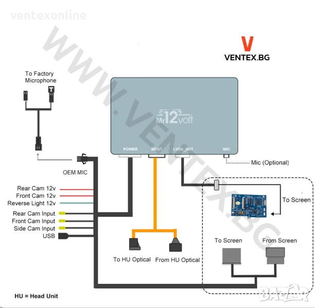 • Входове за предна / задна / лява / дясна камера
