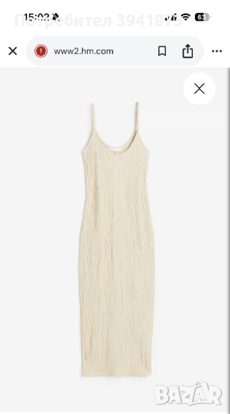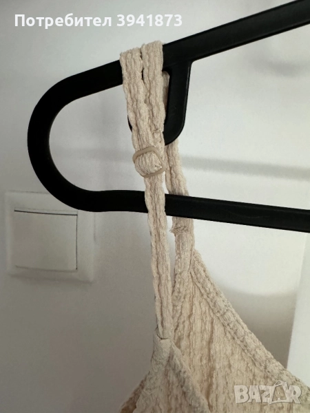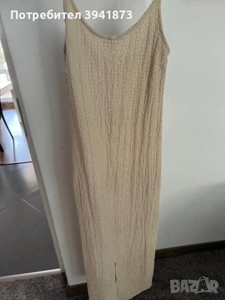 Роклята е по тялото с тънки регулиращи се презрамки от намачкано трико с дължина до прасеца. Има лек “вафлен” ефект.