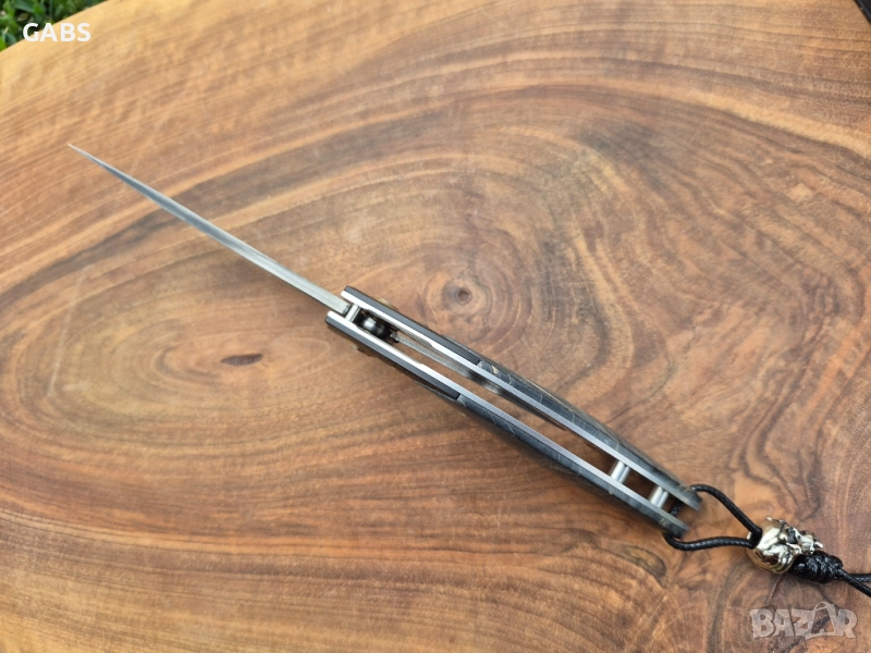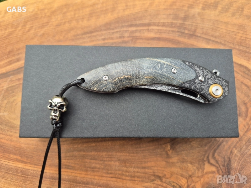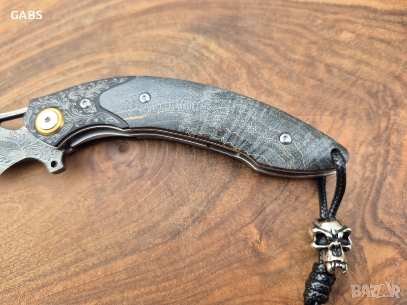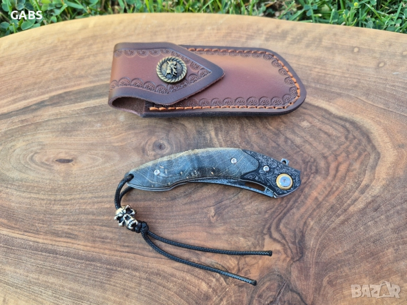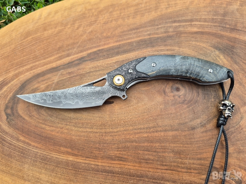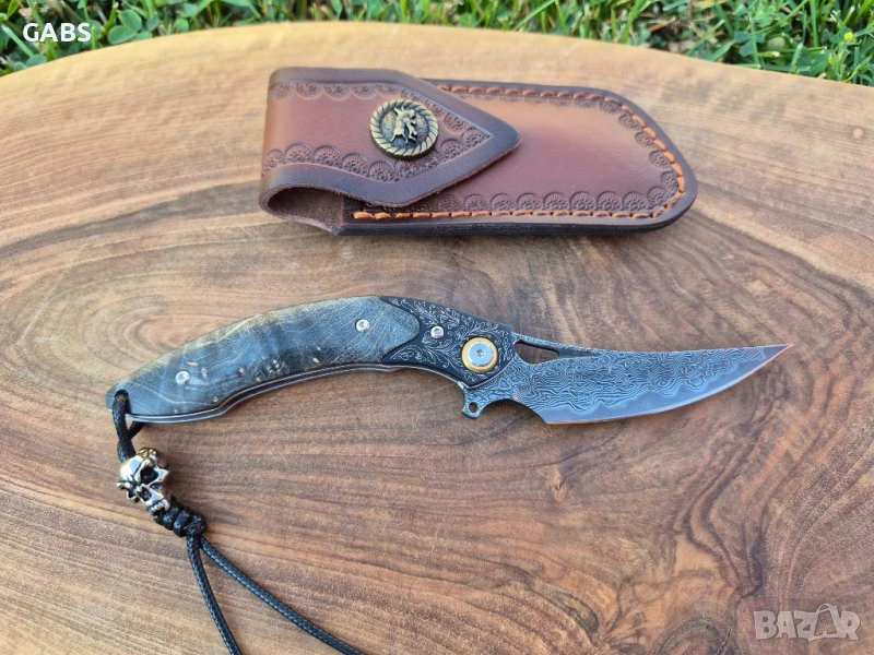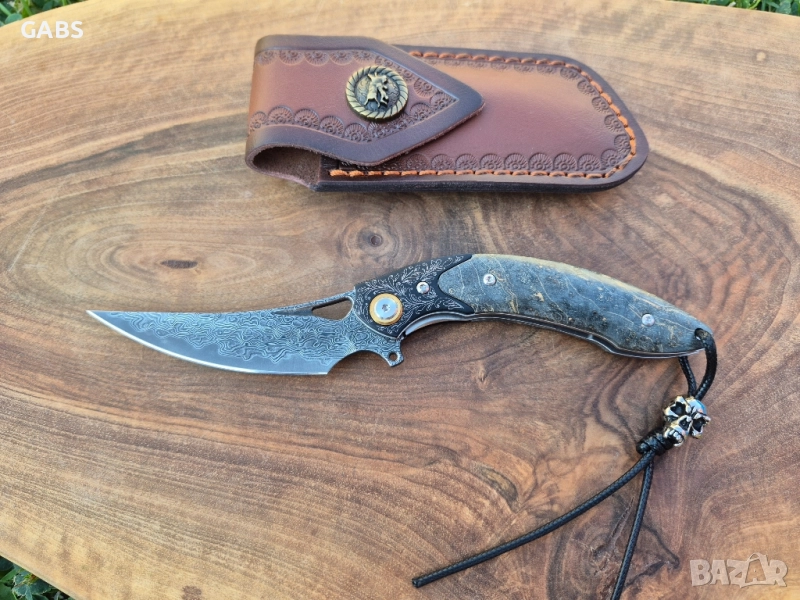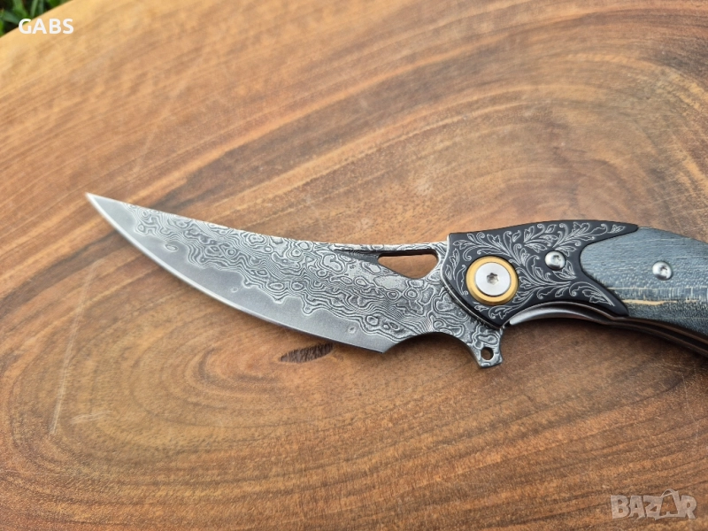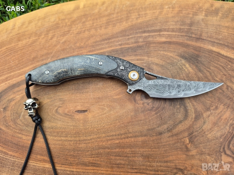 нож,ръчна изработка от дамаска стомана VG10,високо качество и уникален дизайн.Ножът е снабден с съчмен лагер в основата на острието.