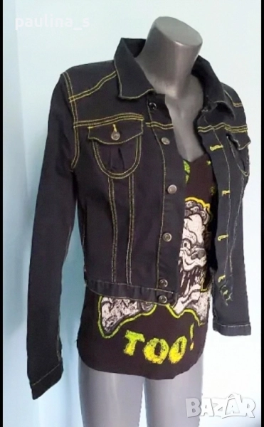 1️⃣. Колаж / Колаж M / XL / "Crazy world". Цената е крайна 39,99лв / 20 евро. Марков дънков топ тип яке, модел Деним, със сигнално жълти маркировъчни конци. Платът е плътен и еластичен, покрива няколко размера. Една бройка е, ново без етикет.