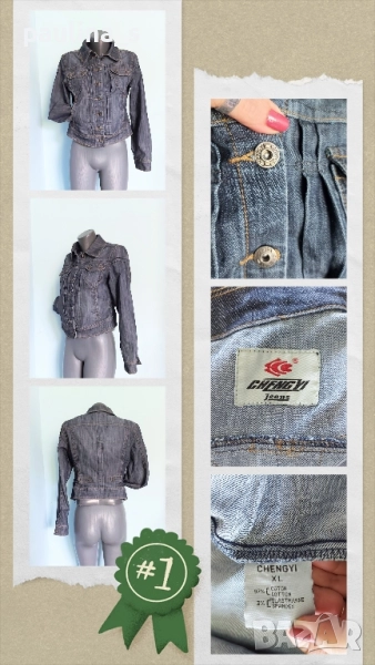 2️⃣. Колаж / Колаж / M / 2XL - "ChengyL". Цената е крайна 29,99лв / 15 евро. Невероятно дънково яке с избелващ ефект. Моделът модифициран 5pocket denim, втален и много разчупен с плохи , басти, кабси. Платът е еластичен, покрива няколко размера. Брандирани копчета и контрастни тегели, фабрично измачкано на места. Без дефекти, като ново.