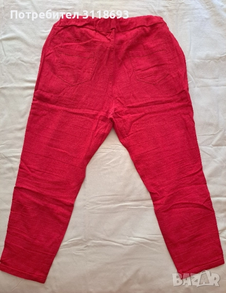 Ленен дамски панталон в червен цвят с джобове отпред и отзад. От лен е, така че е подходящ и за по-топлите сезони. Доста е лек и дишащ като материя. Дължината на крачола е около 83 см, а ширината на талията - около 37 см. Ширината може да се регулира, понеже има връзки за пристягване.