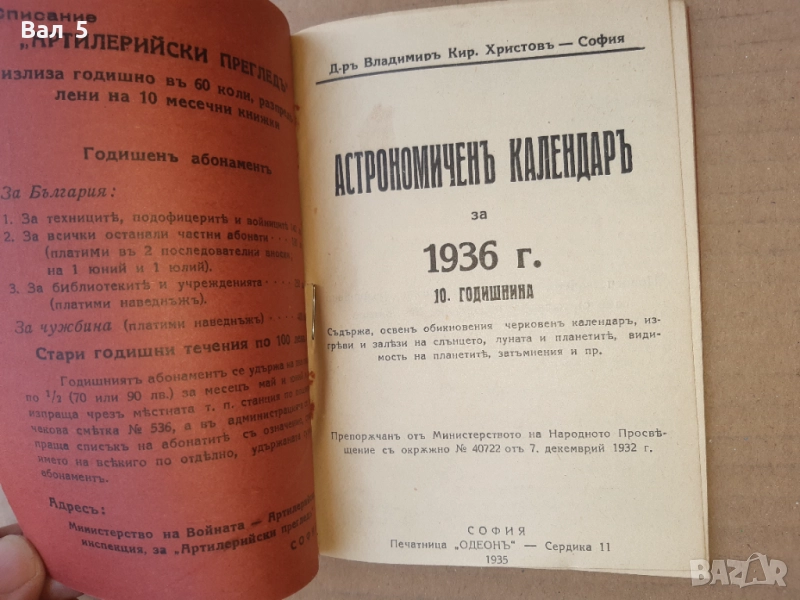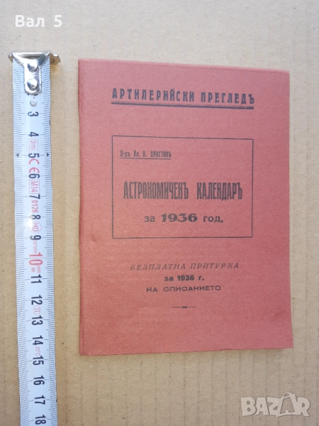 Астрономичен календар за 1936 г - притурка към списание АРТИЛЕРИЙСКИ ПРЕГЛЕД - 48 страници с текст плюс почти толкова празни , за водене на бележки . Отлично състояние . пл ч