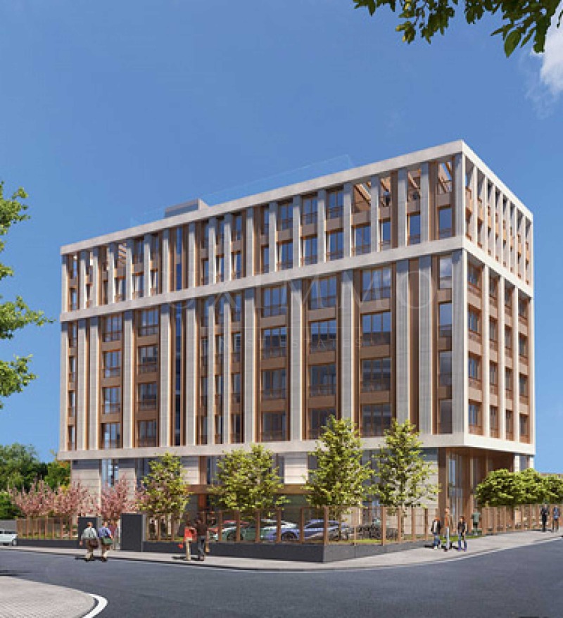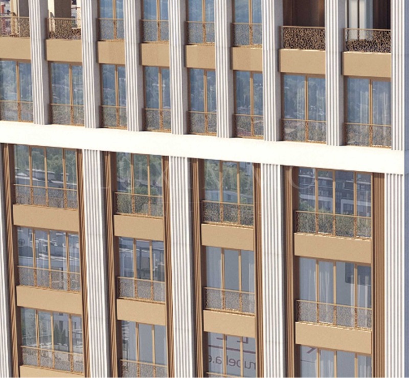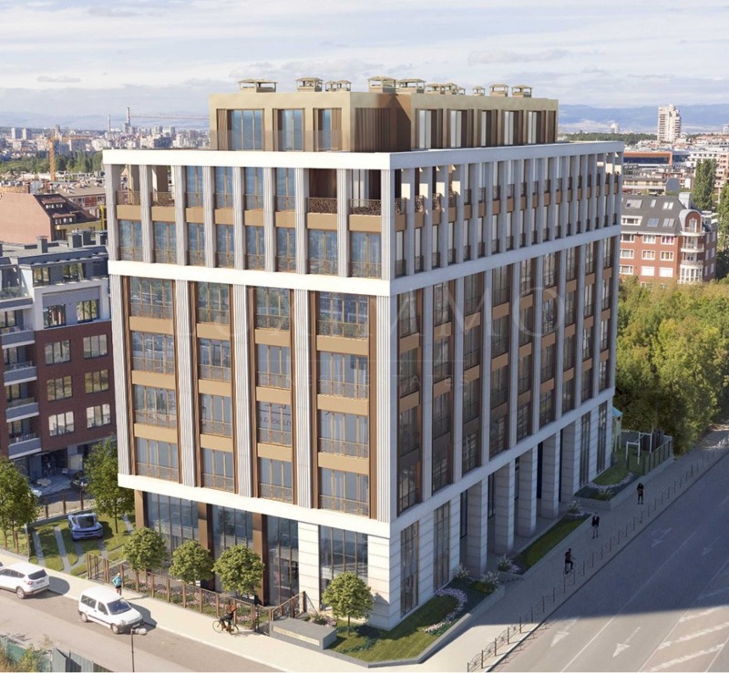 Фасадата на сградата е елегантна комбинация от висококачествен варовик и алуминиеви панели с бронзово покритие.