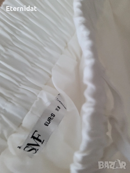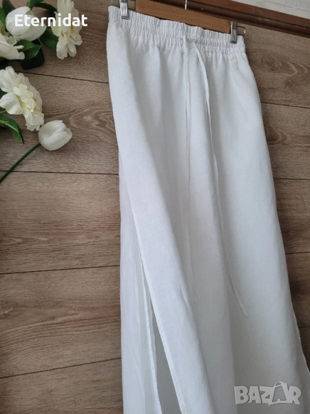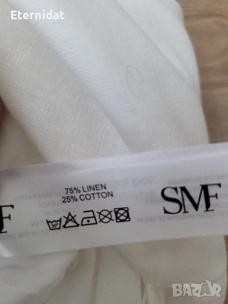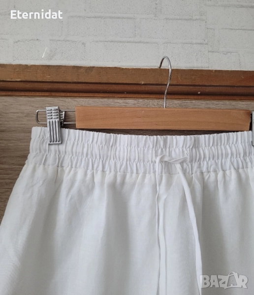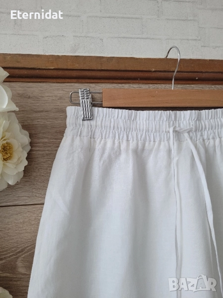 НОВА бяла лятна пола от страхотната материя 75% ЛЕН и 25% ПАМУК. Бранда е SMF. Качество, комфорт, изящество! Ластик в талията и връзка. Допълнителна подплата две странични цепки отдолу. Размер S