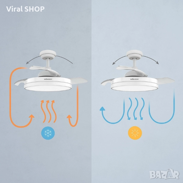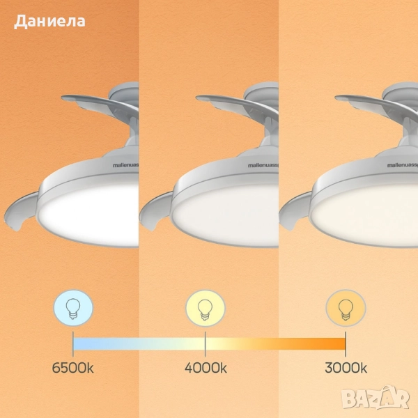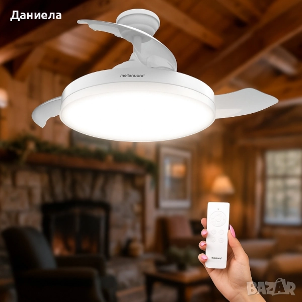 Вентилатор за таван с мотор 40W;. 3 сгъваеми прозрачни перки Ø106 cm; LED осветление с 3 цвята; Дистанционно управление с таймер; Монтажен комплект за прави и наклонени тавани; Транспортна опаковка; Гаранция: 12месеца.