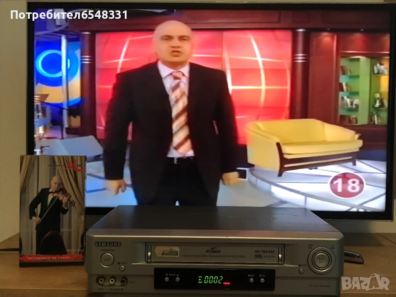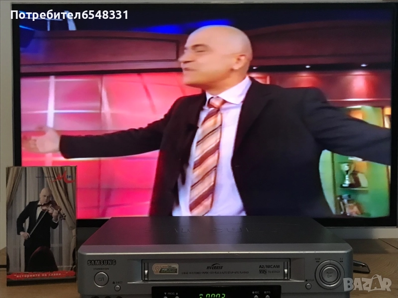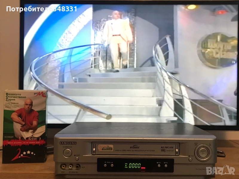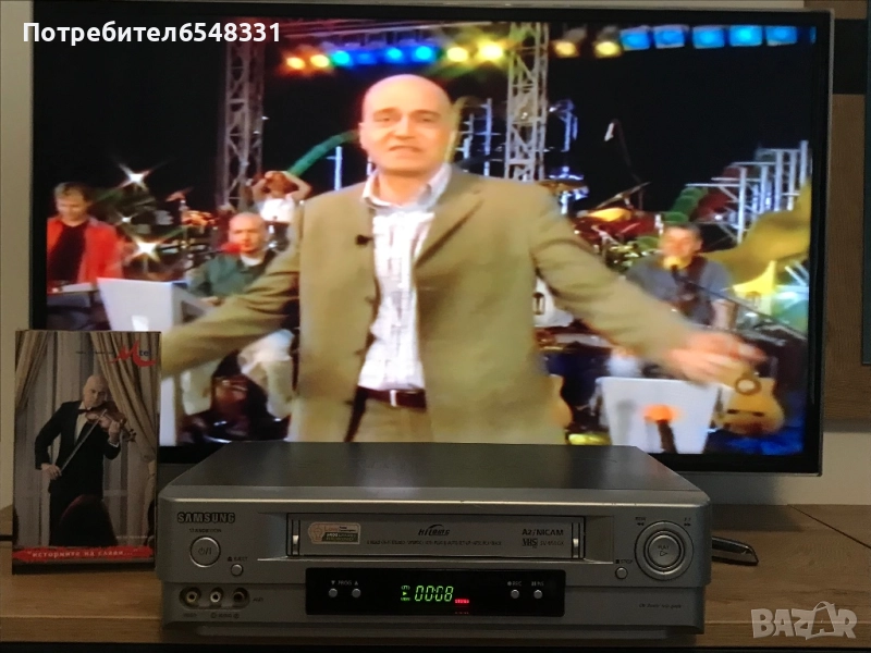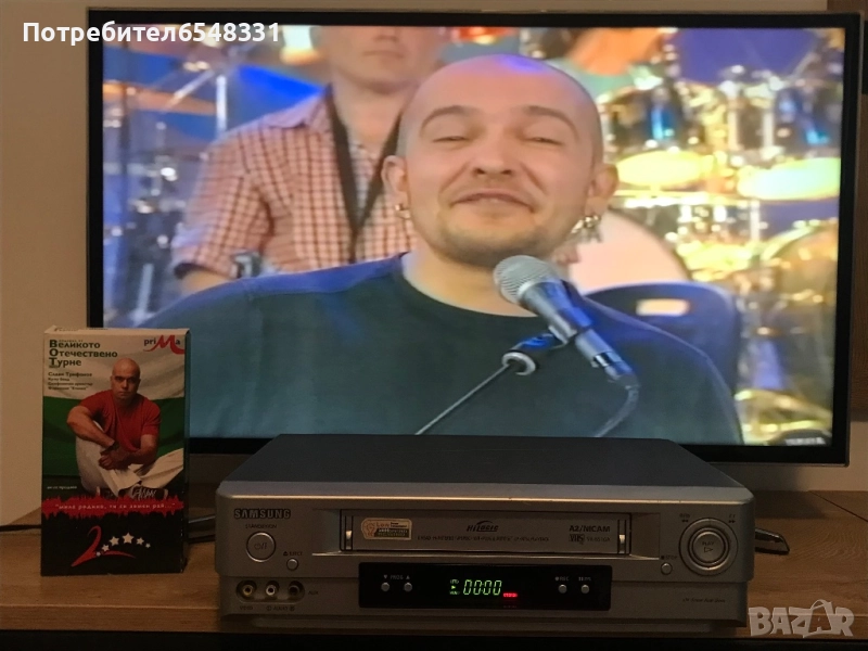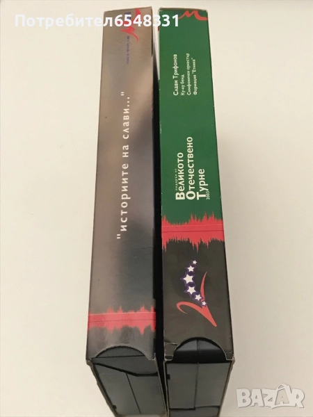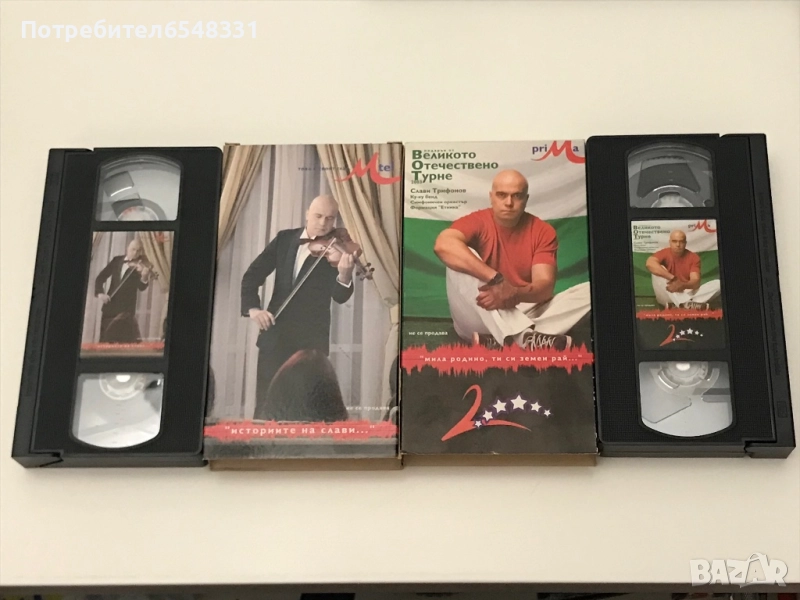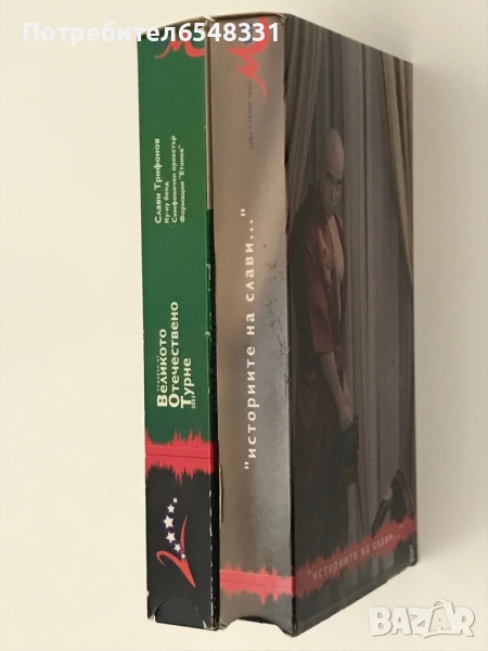 видеокасети на Слави Трифонов . Историите на Слави & Великото Отечествено Турне 2003 година . Отлично работещи и много запазени . И двете видеокасети са с оригинален цветен стикер . Гледани са по веднъж , без мухал и без намачкана лента . Общо състояние 10/10 . Цена 15 лева за двете касети . Моля , разгледайте всички 18 снимки . На последните шест снимки , са снимани двете видеокасети в работещо състояние .