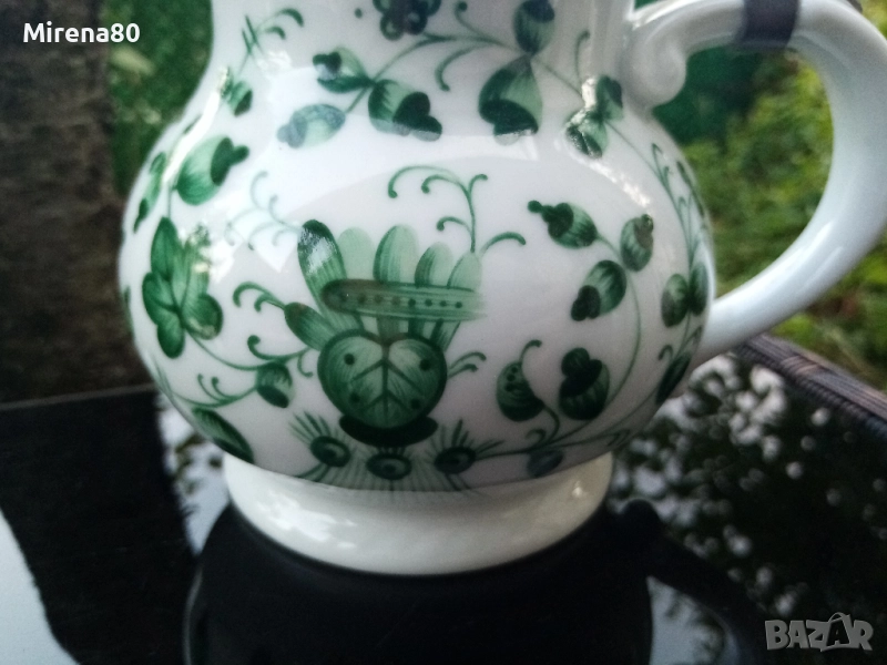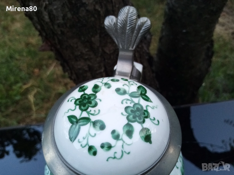 Royal Tettau - модел *Alt Tettau *. Великолепна винтидж халба за бира с калаен капак и разкошен ръчно рисуван декор в изумрудено зелено. Оригинална тумбеста форма, много красива ! Вмест. 500 мл, вис. 16 см. Отлично състояние ! За колекционери и ценители.