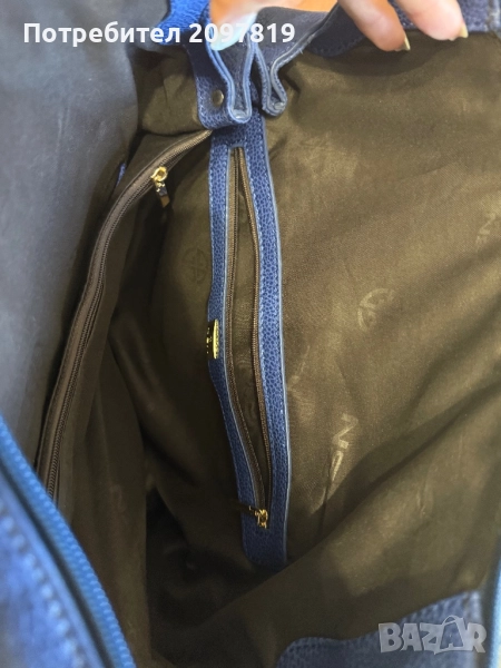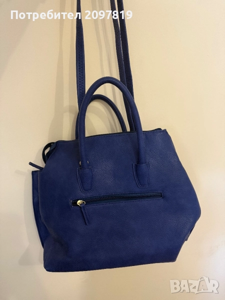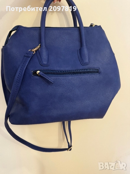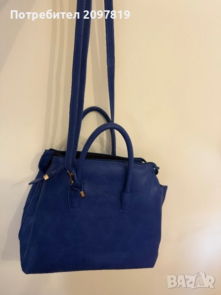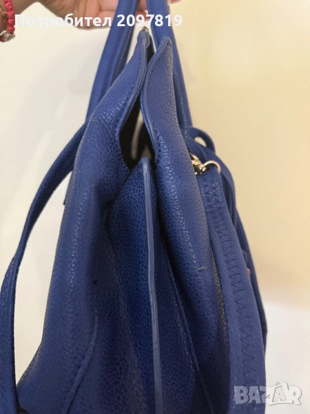 Чантата е носена един два пъти. Цвят турско синьо. Има възможност за къса и дълга дръжка. Има забележки, от самото стоене в гардероба (на снимките се вижда) леко е напукана, но при носене не мисля, че ще се забелязва.