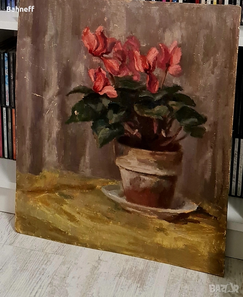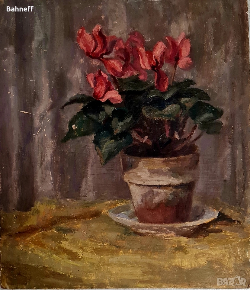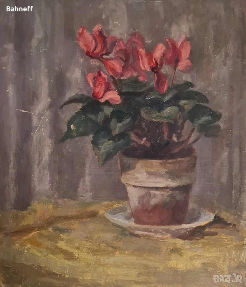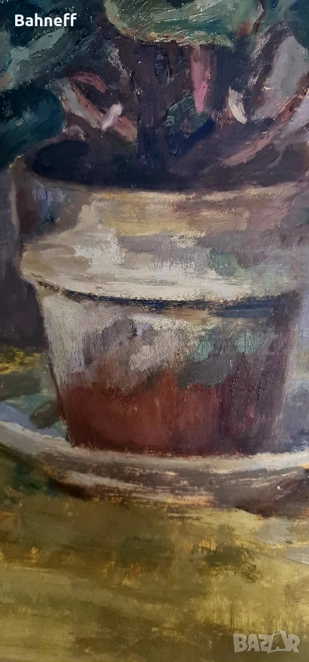 Маслени бои платно каширано въху фазер от двете страни .рисувана от художничката Василка Генадиева 1905 -1973г.Учила при професор Борис Митов и Никола Маринов. Може да се каже най даровита в света на натюрморта. Макар и в по тъмна гама ,въздуха около цветето се усеща.А това е магията на изкуството.Ще бъде сложена и подходяща рамка.Размери 40/48см.